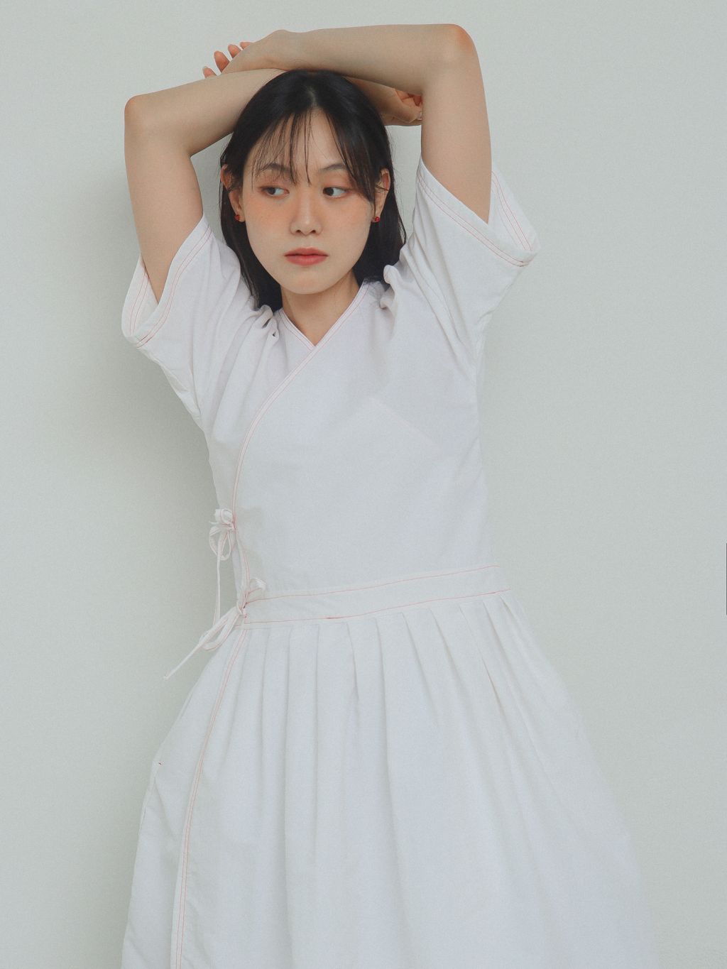 흰 원피스의 끝선을 스티치로 장식한 철릭이 완성되었습니다.