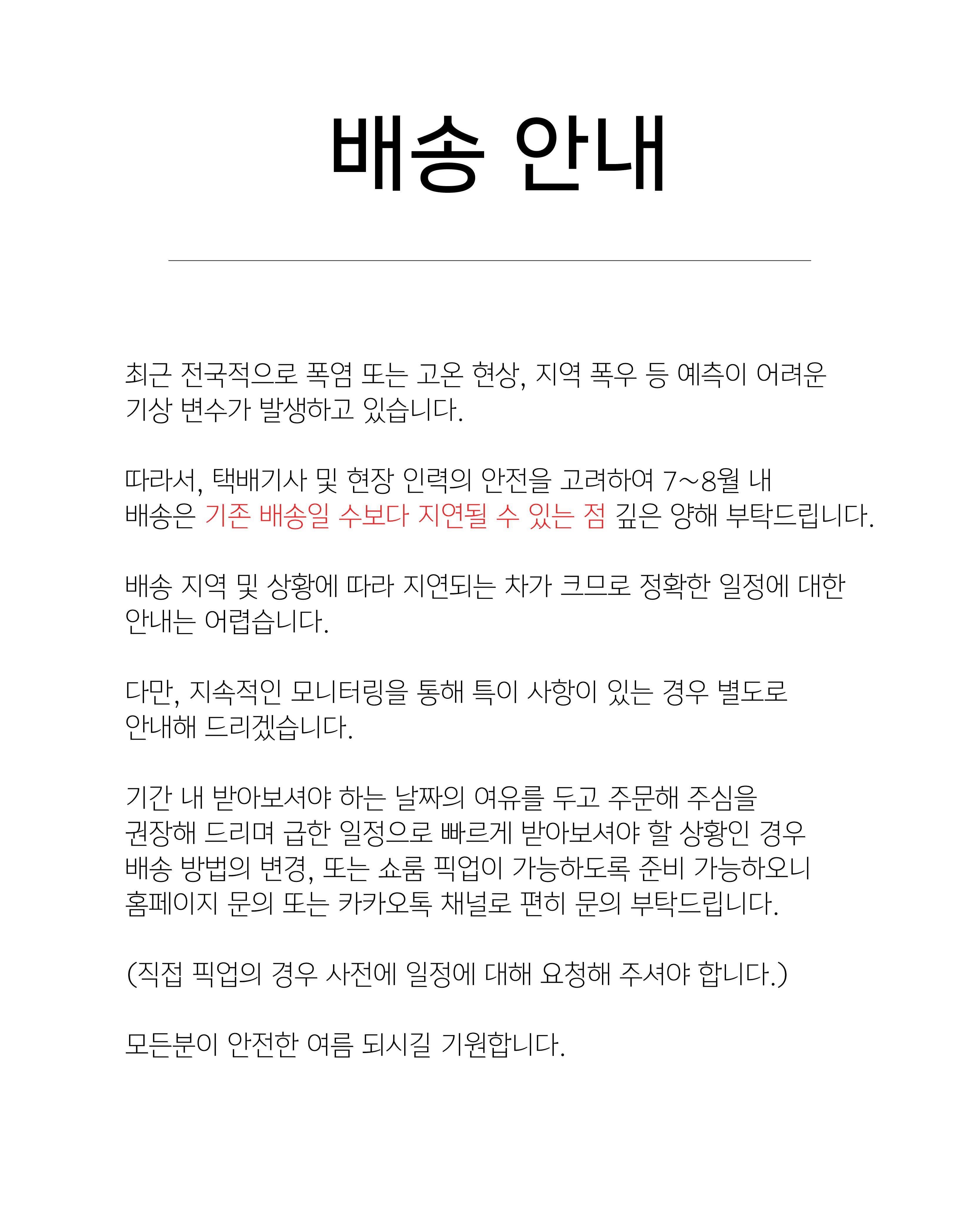 8월 12일(화) 오후 4시 이후 결제 된 주문 건은, 택배사에 접수되더라도 실제 배송은 8월 18일(월)부터 순차적으로 진행될 수 있습니다.