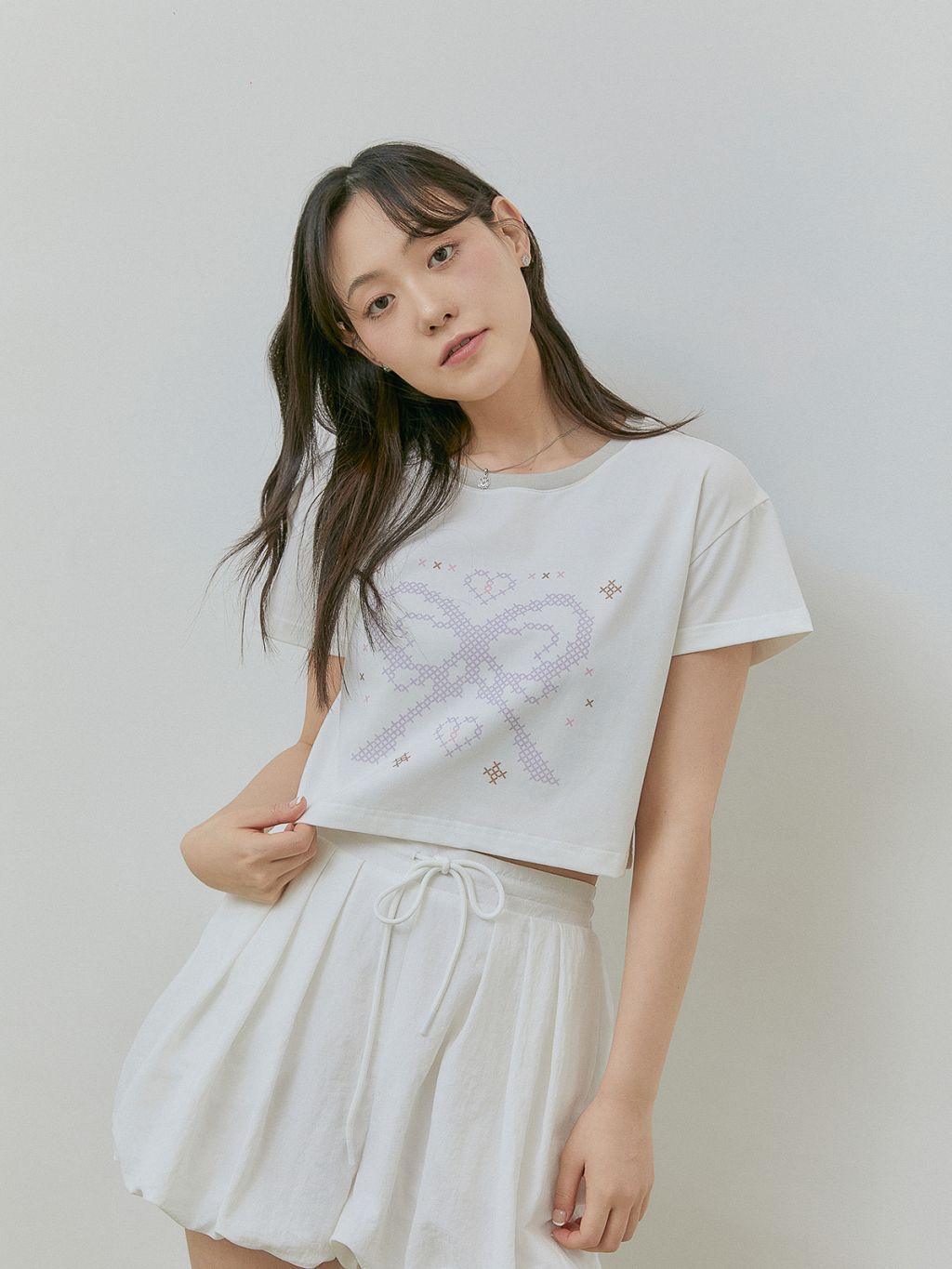 리본 스티치 티셔츠 (연보라) 크롭 M / 말군 구름 쇼츠 (흰색) SM 착용