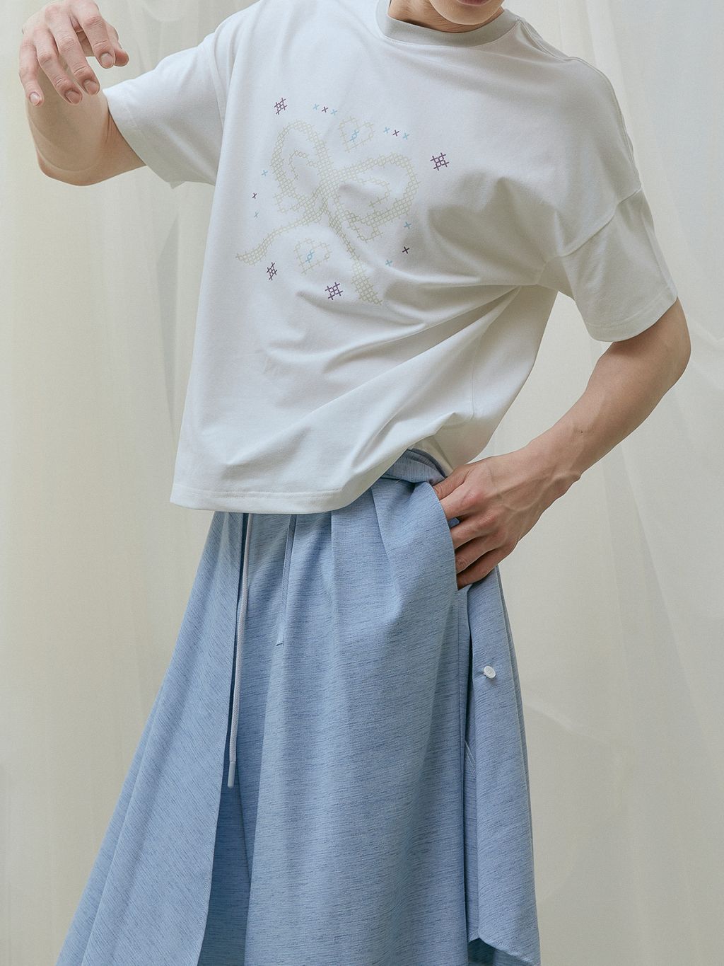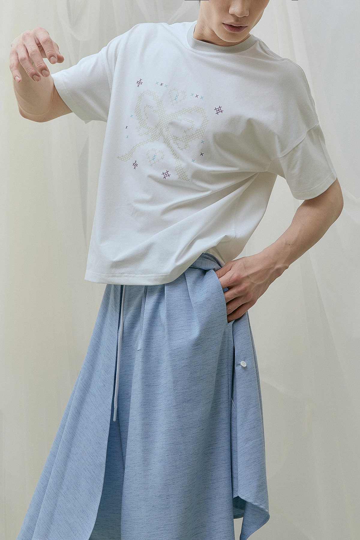 리본 스티치 티셔츠 (연그레이) L / 주릿대 팬츠 셋업 (하늘) L 착용