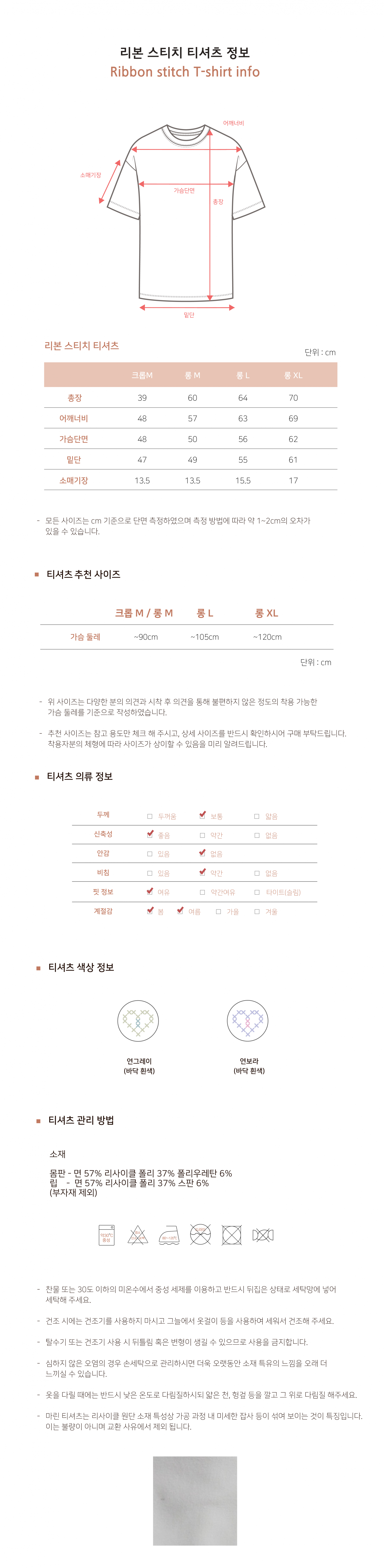 - 몸판: 면 57%, 리사이클 폴리 37%, 폴리우레탄 6%