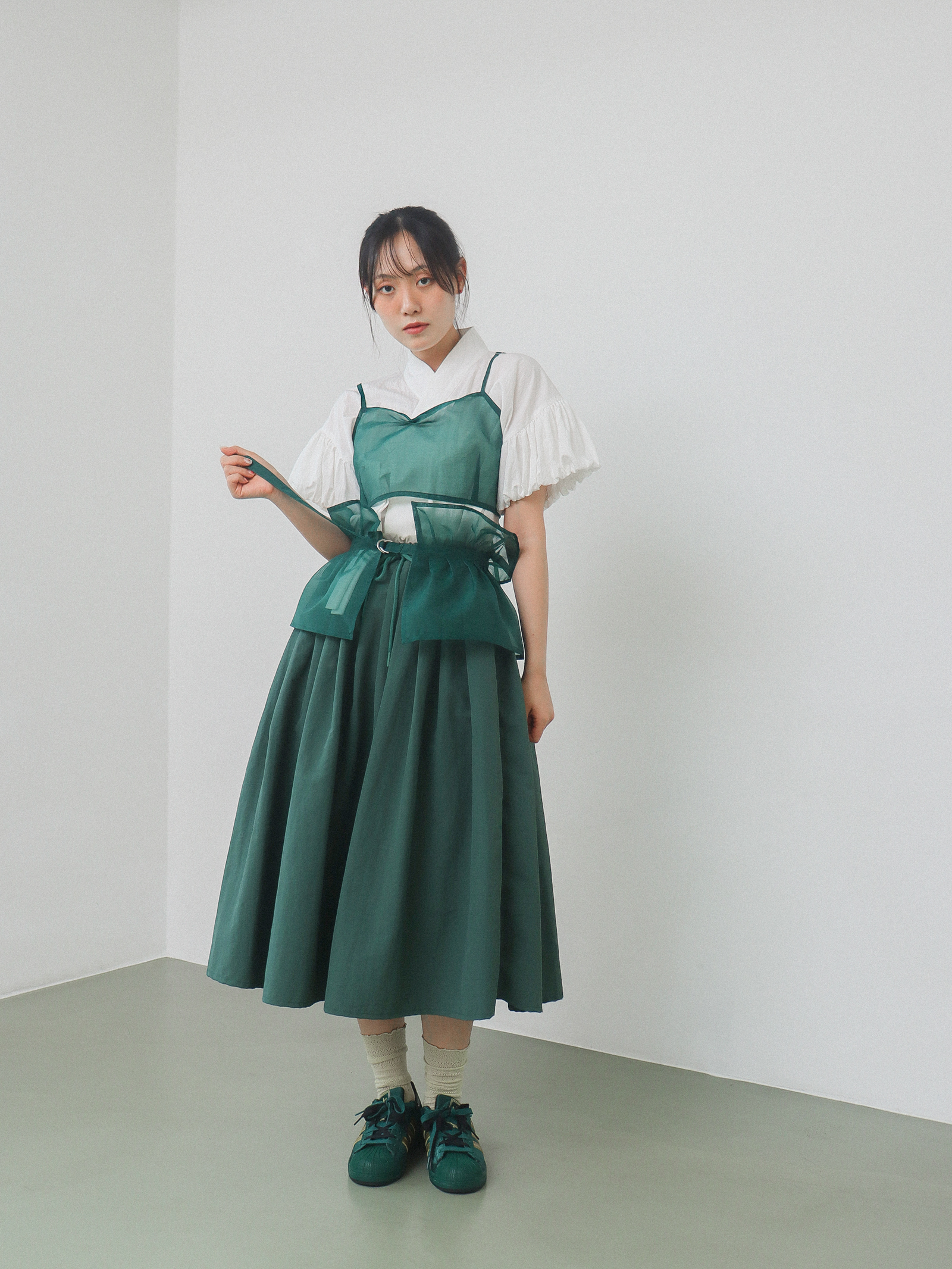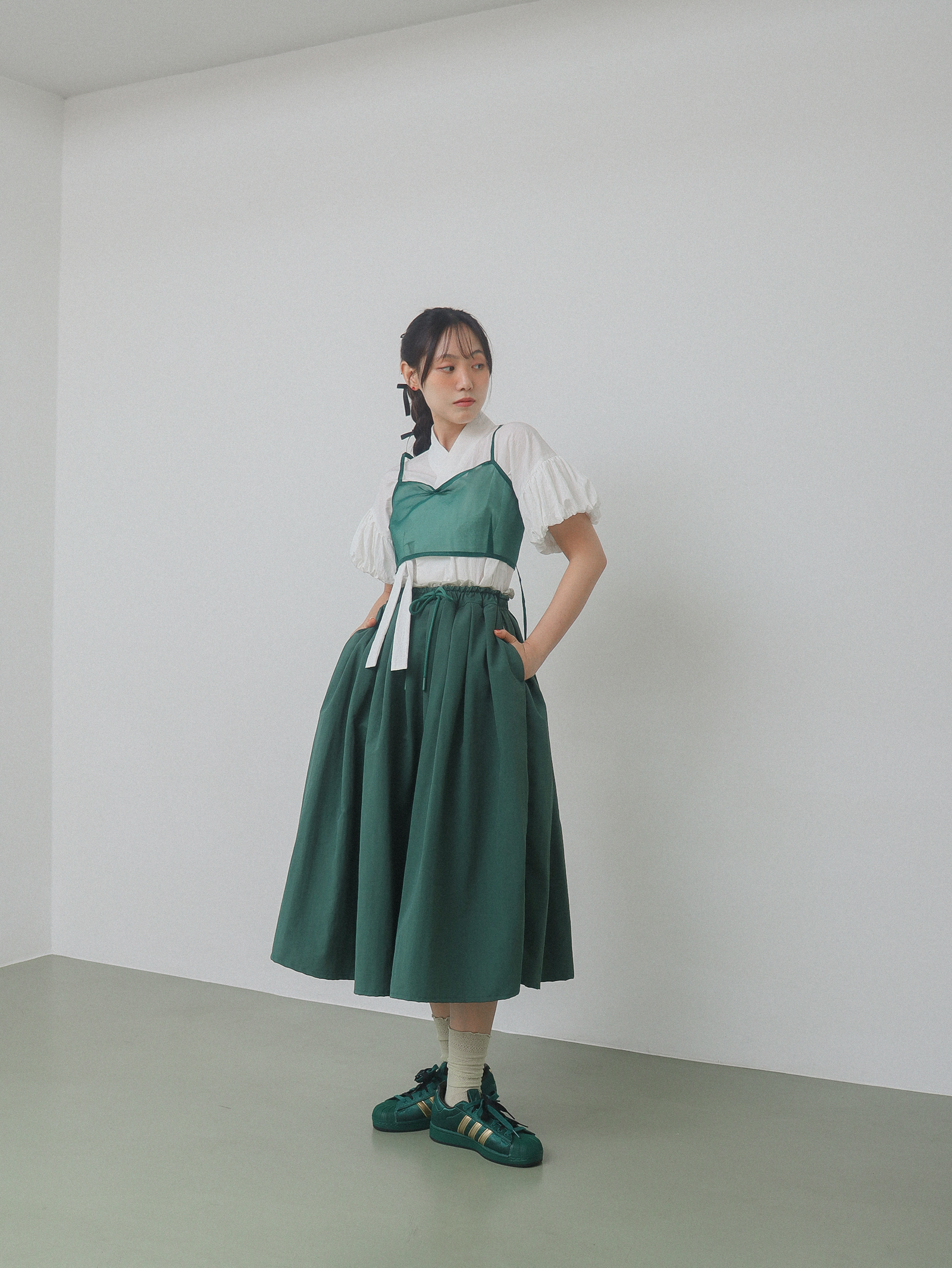 휘핑 저고리 S / 기와 뷔스티에 (녹숙) L / 겹기와 허리치마 (녹숙) M 착용